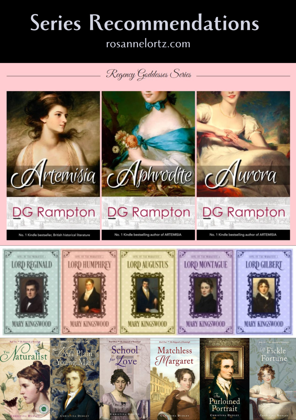 The three titles in the Regency Goddess Series are all stand alone novels. They showcase delightful banter, enterprising heroines, and dashing suitors and follow soundly in the tradition of Georgette Heyer. The hijinks are hilarious and the romance is satisfying as dukes and damsels run amok in the merry chase of matrimony.
