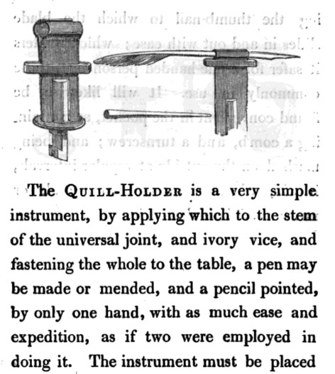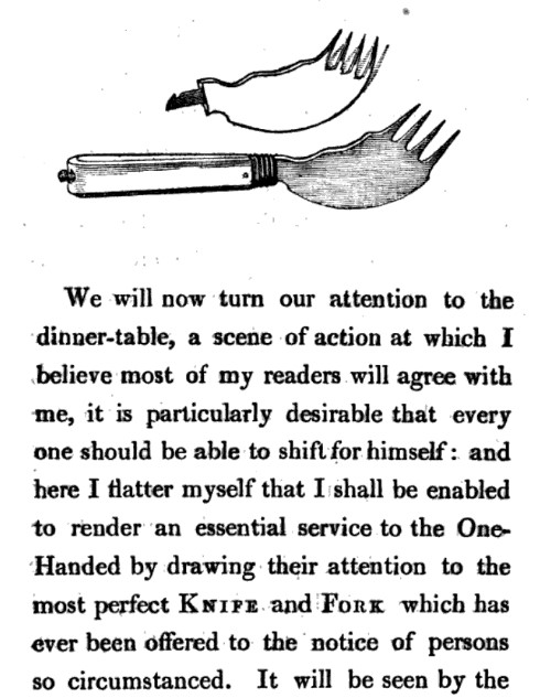 Included in his book are diagrams for a fork with a sharp side for cutting, a vice for gripping pen nibs, and a contraption for holding playing cards (as well as more specialized tools for eating a soft boiled egg and brushing a beaver hat, and pulling on one’s boots).